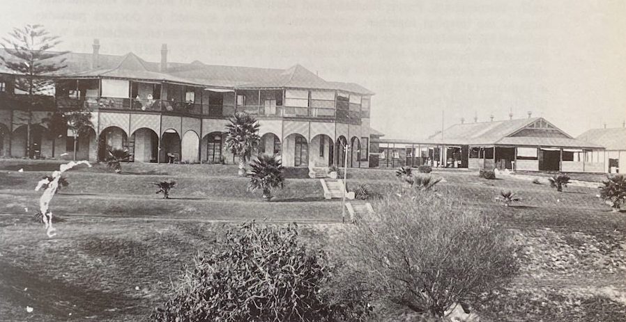 'Government Hospital Fremantle'. Fremantle Library Local History Collection photo #1118 by C.M. Nixon c. 1897. The two storey building on the left is the Knowle (1856), originally the home of Captain Henderson. The floors and staircase were built of Singapore cedar. The house was later occupied by Mr Clifton, Comptroller of Customs and in 1892 was used as a branch of the Fremantle Lunatic Asylum. After a Typhoid Fever outbreak in 1892, a public meeting was called in 1893 to press for a hospital. The Government agreed and J.H. Eales designed alterations to the Knowle which was converted in 1895. In January 1897 it was formally occupied as the Fremantle Hospital. In January 1903, J.H. Eales designed a new operating theatre, instrument room, dressing rooms and outpatient quarters. From left, brick nurses quarters (1898/1899), the Knowle, the laundry, male medical ward, male surgical ward and porter's lodge. Tennis court for staff in front.