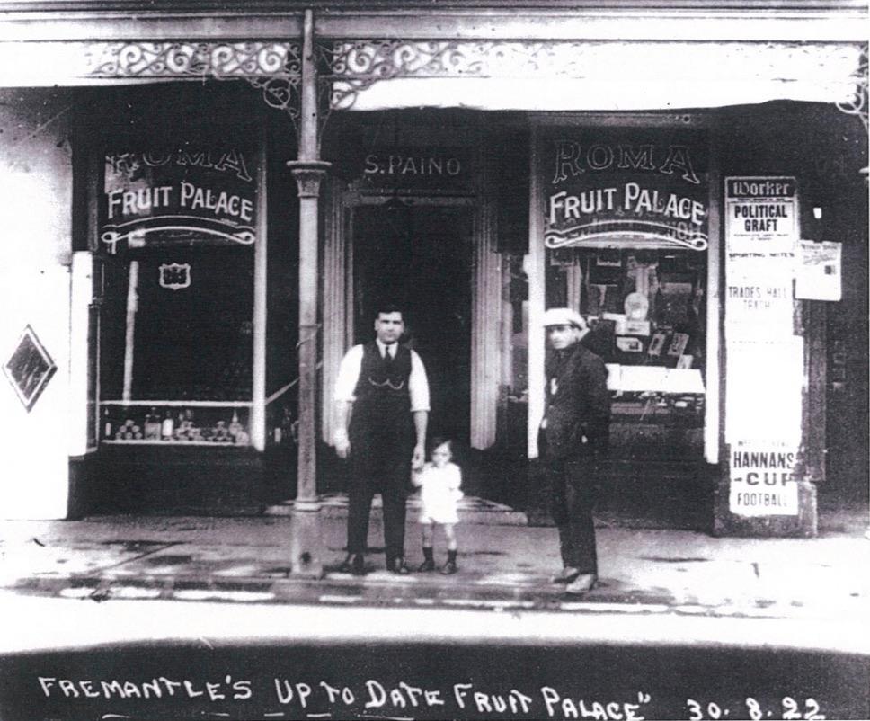 This property was originally 62 Market Street. The Roma Fruit Palace was established by Salvatore Paino (d. 1966) in 1921/1922. He opened the Fish Supply next door [58-60] in 1929/1930. The family lived above the shop. They supplied fish to ships berthing at Fremantle, thus beginning what became Sealanes. Salvatore is in the waistcoat, holding the hand of Cono Paino, (1921-1926). Taken 30 August 1922.