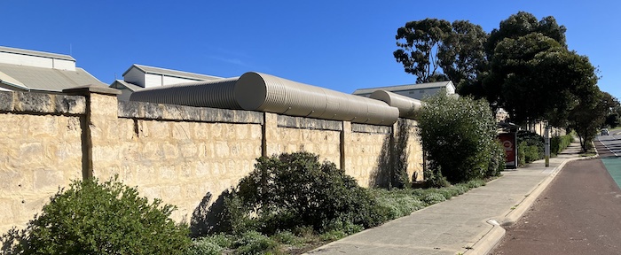 The only other walls are modern, notably the very secure one (shown below) of the locked ward of the mental health section of the Fremantle Hospital.