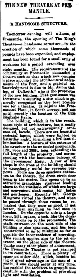 To-morrow evening will witness, at Fremantle, the opening of The King's Theatre—a handsome structure—in the erection of which some thousands of pounds have been expended, and employment has been found for a small army of workmen for a period extending over eight months. The requirements of the community at Fremantle demanded a theatre such as that which now occupies a place amongst the architectural adornments of the Port, and a grateful acknowledgment is due to Mr. James Gallop, of "Dalkeith," who is the proprietor of the new building. That gentleman was fortunate in securing a site which is generally recognised as the best possible one for a theatre. It adjoins the Freemasons' Hotel, in South-terrace, and was until recently the location of the Olde Englyshe Fayre.
