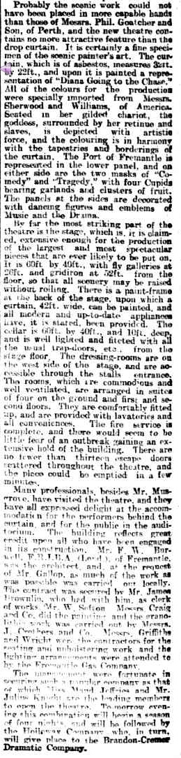 Probably the scenic work could not have been placed in more capable hands than those of Messrs. Phil. Goatcher and Son, of Perth, and the new theatre contains no more attractive feature than the drop curtain. It is certainly a fine specimen of the scenic painter's art. The curtain which is of asbestos, measures 32ft. by 22ft., and on it is painted a representation of "Diana Going to the Chase."