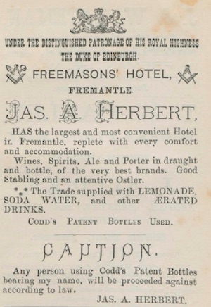 James A. Herbert was the licensee of the Freemasons Hotel in 1882 (advertisement in the 1882 WA Almanack.) F.T. Pamment was the licensee in 1888. Western Mail Saturday 8 December 1888: 8. Otto Wehrstedt was the licensee in 1892. The West Australian, Wednesday 7 December 1892: 3. Alfred Court was the licensee in 1897. Western Mail, Friday 10 December 1897: 35.