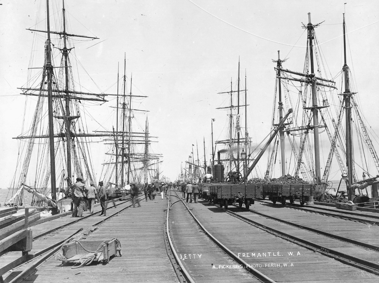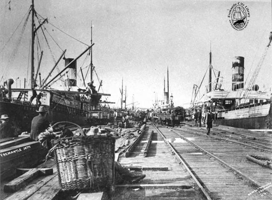 This 1897 photo is Fremantle Library image #2055, with this caption: 'The Long Jetty was completed in December 1873 and extended to over 3000 feet in 1892. Until the Harbour was completed it was a very busy place. The ship on the left is unloading "bulk" using baskets and trams. Taken before 1897.' The photographers' names are in the bottom right corner. My guess is that it is Bertel & Williams.