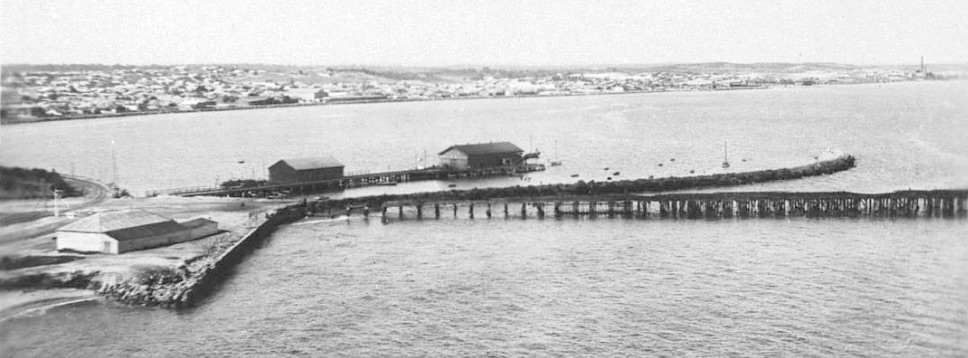 1873 ... saw the completion of the first section of the old Ocean Jetty [the Long Jetty]. That section ran in a south-westerly direction from Anglesea Point and the structure was afterwards extended in a westerly direction to a total length of 2,830 feet, the depth of water at its head being 20 feet on the north side and, 21 feet on the south. The first section was constructed by Mason, Bird and Co., of the Canning Saw Mills, and later two extensions of 1,000 feet and 450 feet were carried out by R. O. Law and Matthew Price. The jetty was little used after the opening of the river harbour in 1897 and after being closed to traffic and used only as a promenade for some years, it was doomed to demolition in 1921. That old jetty was historic for over its planks the first representatives of many families now well established in Western Australia made their first entry into the Golden West. (Hitchcock: 57-58)