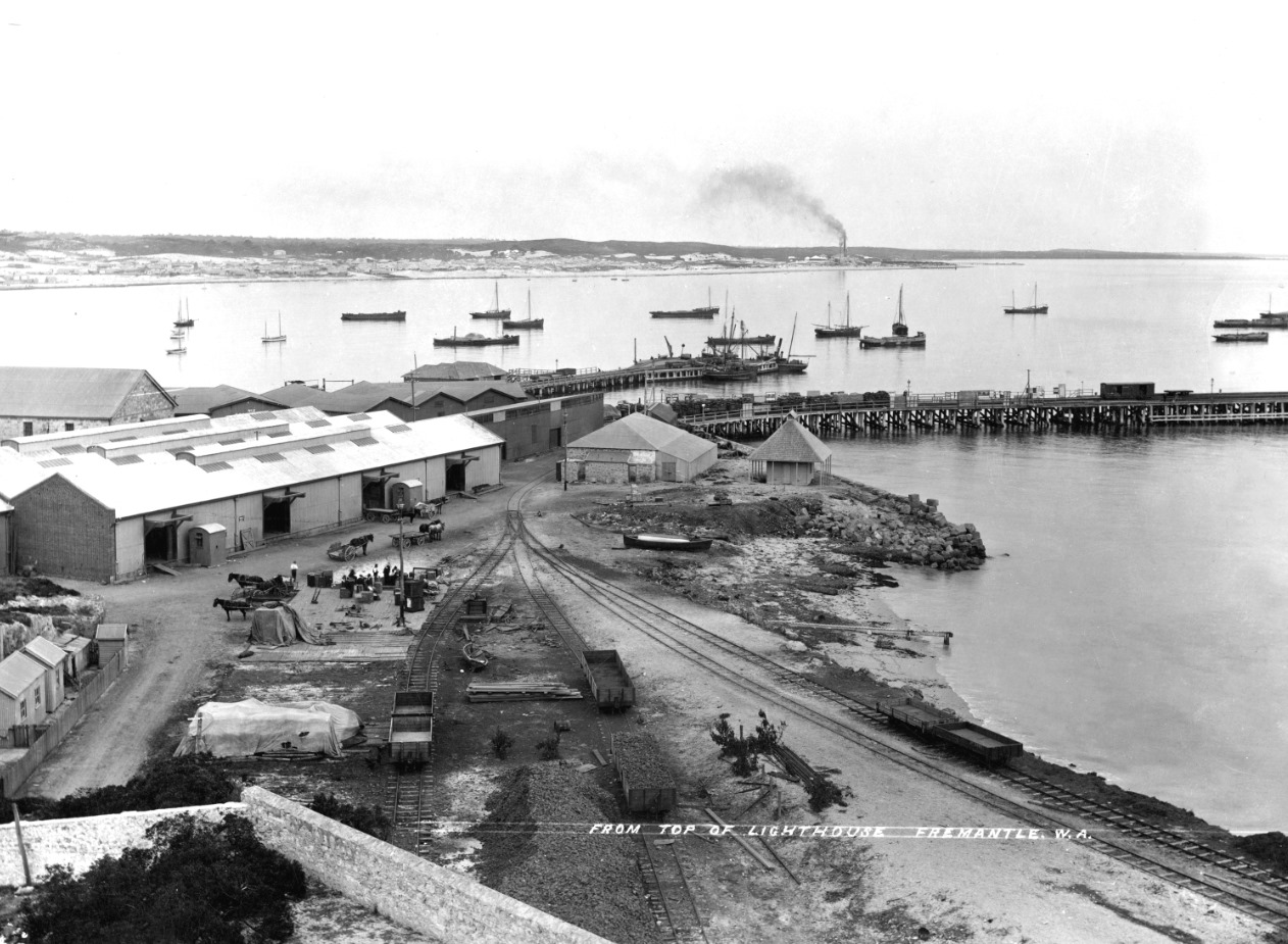 A view from Arthur Head lighthouse, with the stone wall around the Round House in front. On the left is the Commissariat; and in the centre, South Jetty. To the right is the Long Jetty with the Kerosene Store and Bathers Bay in front. Fremantle Library photo #1611 c.1891.