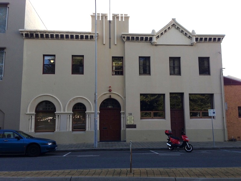 Former Court House. Architects: Public Works Department. Builder: J.J. Harwood and Sons. At the south-West corner with Marine Terrace. This cruciform building was completed in 1884. It has massive walls, up to 60 centimetres thick, and has cells in the basement. The large portico, of three arches with a large pediment, is reminiscent of the Palladian style, perhaps intended to convey the dignity of the law. This building was used by the Uniting Church for some years. 2005: NDUA Courthouse. Hutchison.