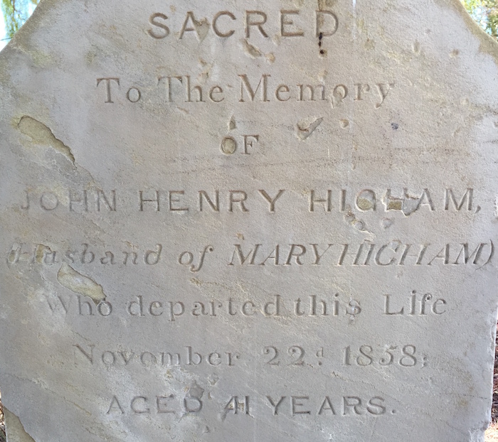 There is a memorial to Mary Higham in Fremantle Cemetery at Congregational D 255, tho her remains may still be in the former Skinner St Cemetery. MCB. Her husband John Henry Higham's 1858 gravestone is preserved on the Heritage Trail in Fremantle Cemetery.