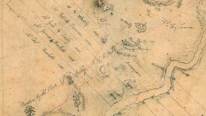 A clip from Roe's 'eye sketch' of 1829 showing, from left, the grants of Edward Birkett, that of his father James, Mr Darby's, that of Robert Thomson, and that of Dr John Whatley, who left his name alongside the railway as the extant Whatley Crescent. The river shown is the Swan, at what is now Bayswater.