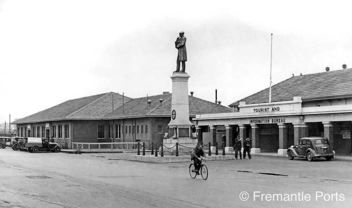 On the back of the quay, opposite the space between B and C Sheds. The state appointed its first immigration officer, A.O. Neville, in 1906. An Immigration and Information Bureau was erected on Victoria Quay at the western end of where C Shed now stands. In 1912-15, to allow for extension to C Shed, it was moved to a site at the end of the overhead bridge, which provided access for pedestrians crossing to the Railway Station. In the 1920s, colonnades were added to the front of the building, and new waiting rooms were erected on the western side. Following the decline in immigration during the Depression, the signage was changed to read ‘Government Tourist Bureau’. During World War II, it served for military purposes and after the war, until 1947, it was used by the navy for the repatriation of Royal Navy personnel and war brides. Government officers, including the Tourism and Immigration Agent, then returned to the building, in preparation for the mass migration scheme. From 1947 to 1970 ships brought nearly two million immigrants to Australia from Britain, Europe and Commonwealth countries. The Tourist Information Bureau vacated the premises in August 1966.