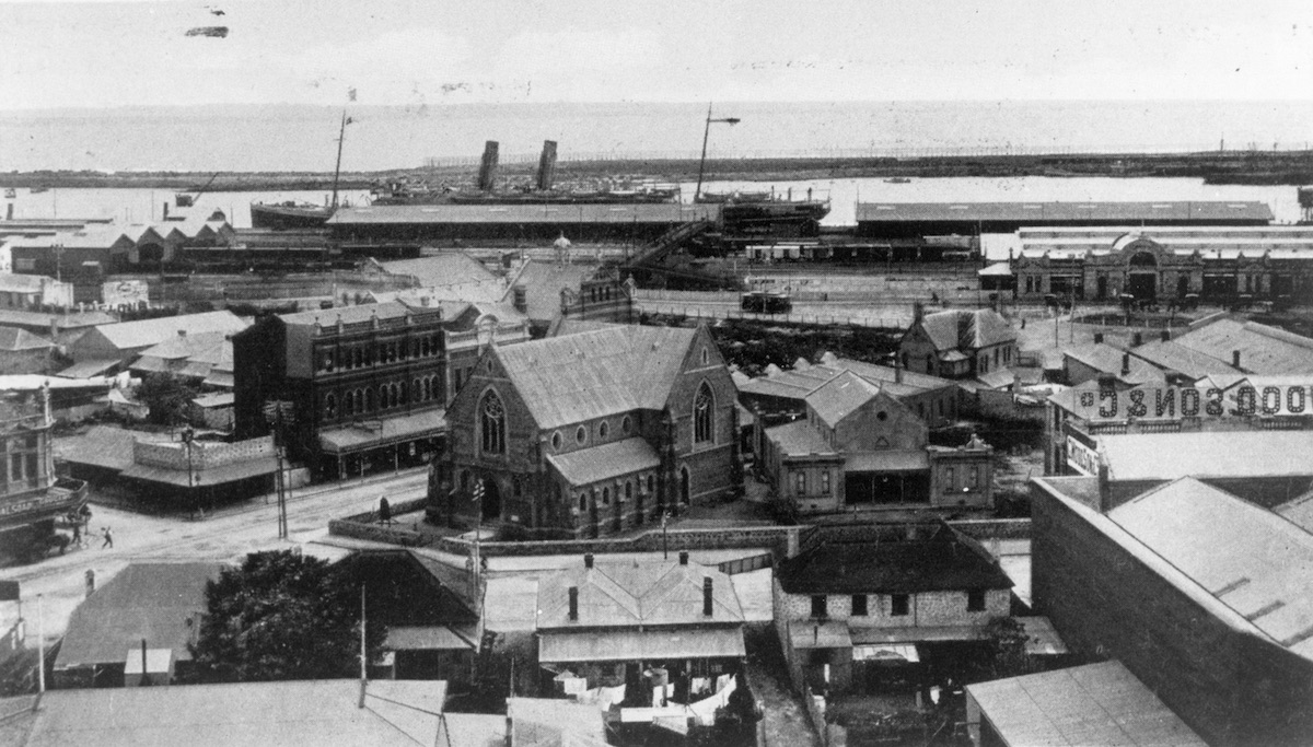 The extreme left of this photo is Market Street. Cantonment Street begins here and stretches away to the right (north-east). The first building is the Wesley Church, still extant. Next is the 1841 Wesley Chapel, the first religious building in Fremantle, with newer classrooms added on to its sides. Following that is the Wesleyan manse (the minister's house). Following that, but not in the photo, were the Fremantle Gas & Coke gasometers.