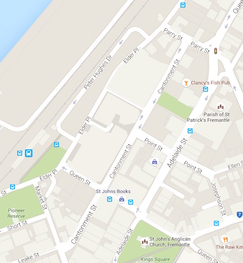 From Market St to Parry St, Cantonment Street (like Adelaide St, to which it is parallel) is three blocks long. The central Wesley church is at the southern end, opposite Atwell Arcade, currently undergoing a transformation. That is only one of several major projects soon to be undertaken in the street, notably the current Woolstores shopping complex between Queen and Goldsborough Streets, and, in the next block, the old wool stores themselves. The Parry Street end of that section has already been rebuilt as apartments, and work has begun on the remaining large building.