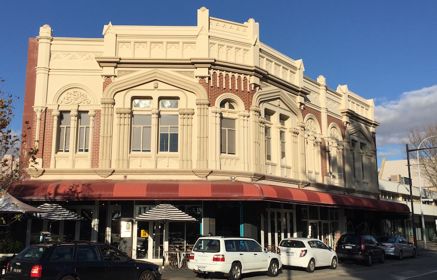 I'm calling this the Lewis building because it was built for him, and seems never to have had any other name. It has the lowest number in the street: 2-6 Market Street on the corner of Elder Place. This richly decorated brick and stucco building, with some Byzantine influence, is of an unusual style for Fremantle. It is a pity that ground-floor alterations have been unsympathetic. The site was owned by the Wesley Church Trustees and this building was completed in 1915 for Ivan Lewis. The Wesley Trustees owned it again subsequently, as did the builder Richard Rennie for a period. The building currently houses a cafe called Il Cibo, but the didgeridoo shop is closed.