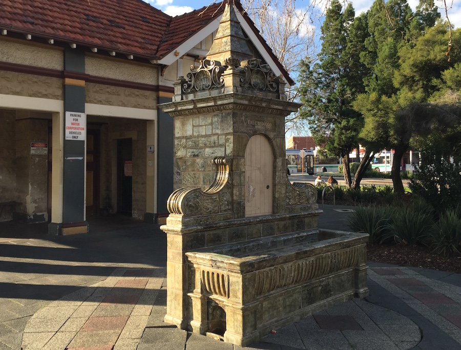 Taylor Memorial Fountain and Horse Trough, between the pumping station and the coffee shop, commemorates two young English migrants, Ernest and Peter Taylor, who died in Western Australia in 1905. Their father, John Taylor of London, commissioned the memorial. He intended, it is believed, that it would be a facility for all creatures: humans, animals and birds. It was prefabricated at the Doulton factory in London and arrived in Fremantle in 1905. It was erected when the alignment of the station had been determined. It fell into disrepair by 1976 due, it was found, to foundation problems. It was restored by the City of Fremantle in 1981-83 using a National Estate grant. The renowned Fremantle potter, Joan Campbell, reconstructed missing pieces, producing a glaze to match the original green of the tiles. The memorial was moved about two metres onto new concrete foundations.